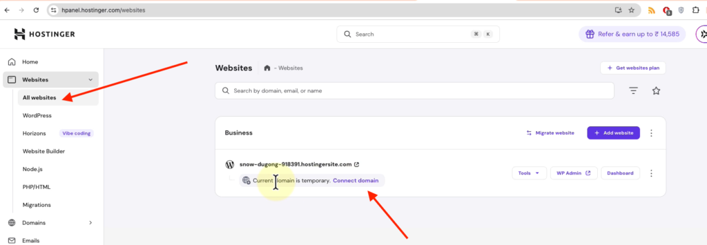 Open the Hostinger account for the existing domain